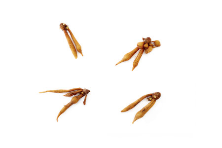 Close up Magic shroom. Psychedelic drug. Dry Psilocybe cubensis. Albino A strain. Psilocybin Mushroom. White background. Psilocybin mushroom.