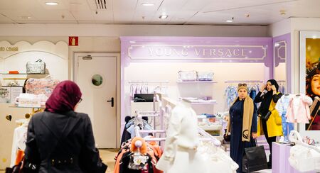 Barcelona, Spain - Nov 17, 2017: Female tourists customers shopping for Young Versace in upscale fashion clothes store in El Corte Ingles mall