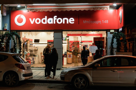 Thessaloniki, Greece - December 8 2020: Vodafone telecommunications store facade with logo. Illuminated night view of crowd at store entrance of Hellenic mobile operator.