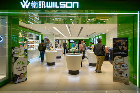 HONG KONG - CIRCA DECEMBER, 2019: entrance to Wilson Communications mobile phone store at New Town Plaza shopping mall.