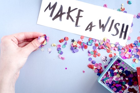 The inscription WISH LIST in a white notebook. A woman writes plans for the next year or birthday. Beautiful yellow background with gold sequins