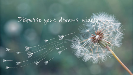 A close-up view of a dandelion seed head with seeds dispersing into the wind showcases a fleeting, hopeful moment, perfect for conveying themes of aspiration and new beginnings.