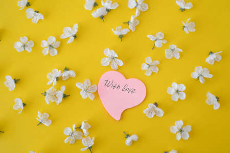 Flowers on a yellow background. Cherry blossoms. Cherry tree flowers on paper background. a sheet of paper with the inscription with love. Spring holiday gift concept. International Women's Day, Mother's Day, St. Valentine