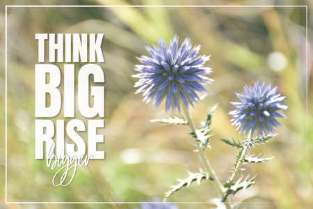 Think big, rise bigger. Banner design. Blue mountain flower in forest, macro photography. Motivational inspirational life quotes. Typographical poster design