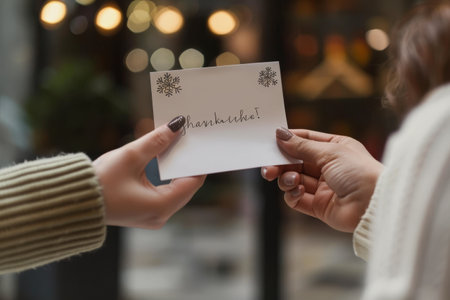 A person holding a card with a snowflake design on it, A customer receiving a thank you note from a company for their loyalty