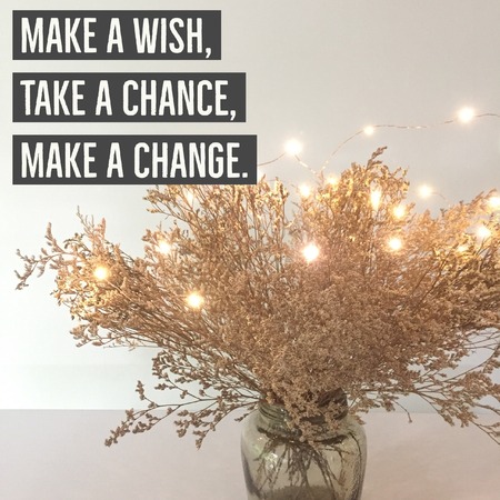 Inspirational quote Make a wish, take a chance,make a change on dried flowers in glass bottle background