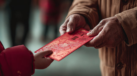 Red envelope being handed over with warm hands during festive celebration, symbolizing good luck and tradition