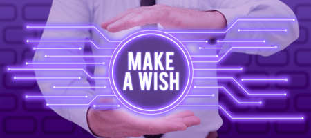 Conceptual display Make A Wish. Word Written on To have dreams desires about future events Be positive Man Having Futuristic Design In Hands And Presenting Crucial Information.