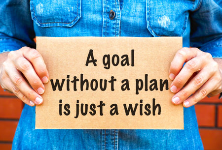 Woman holding a piece of cardboard with words A Goal Without a Plan is Just a Wish in her hands