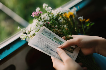 Young woman holding train tickets and wildflowers by the window, expressing joy in a vibrant, green setting, perfect for travel and adventure themes
