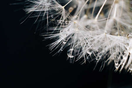 Shiny dew drops on a dandelion seed. Macro shot of a dandelion. Natural background, sparkling bokeh. Art photography. Shallow depth of field.
