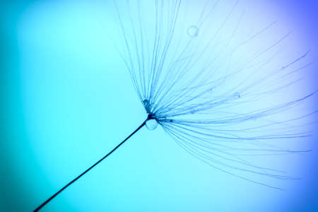 Beautiful dew drops on a dandelion seed macro. Beautiful soft blue background. Water drops on a parachutes dandelion. Copy space. soft focus on water droplets. circular shape, abstract background.