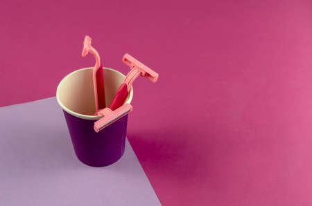 Pink plastic razors in a lilac glass on a pink and light lilac background. Three new ladies' razors in Paper Cup. Selective focus. Copy space