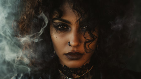 Adult Indian Woman with Brown Curly Hair Goth style Illustration.