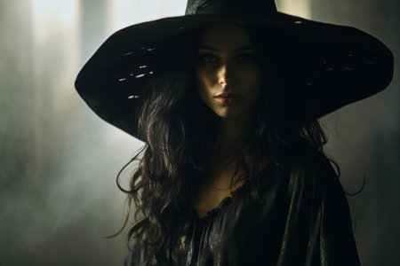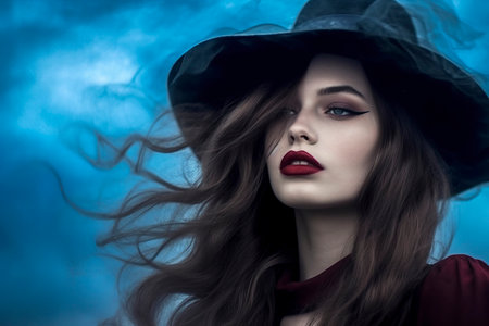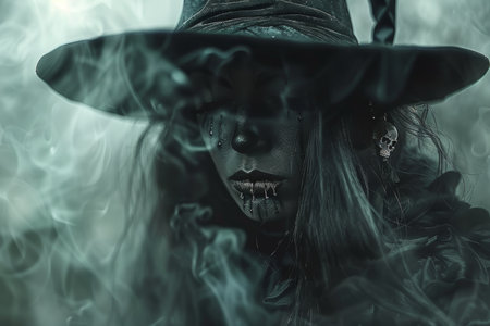 Gothic Elegance. Mysterious witch, creative makeup, wide-brimmed hat, emerald green smoke.