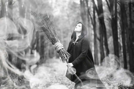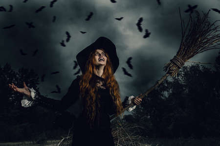 A portrait of an angry witch with a broomstick near the forest. Magic, dark force, spell.