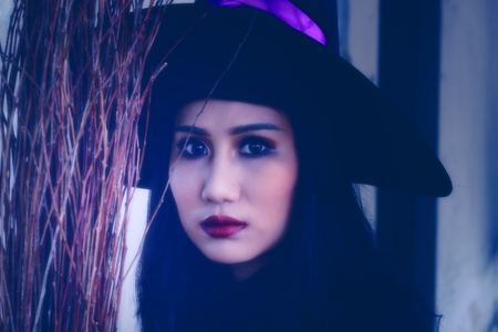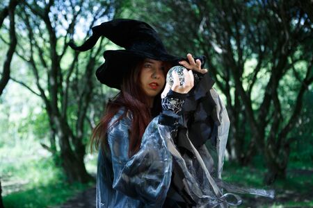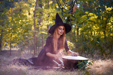Portrait of a beautiful witch in the forest. Halloween theme.
