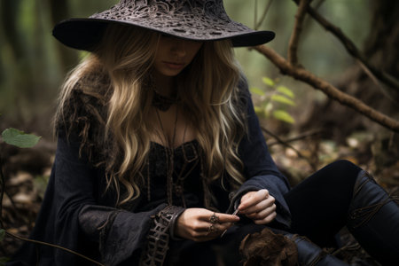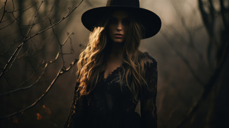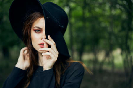 woman in the forest in a black hat gothic style Witch costume