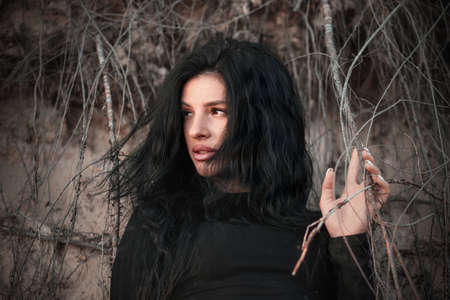 woman in black witch costume in forest nature posing