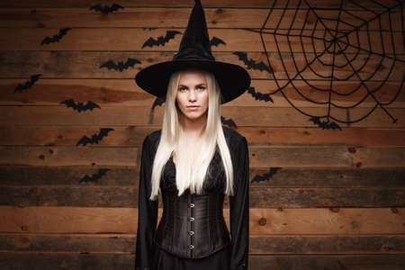 Halloween witch concept - Happy Halloween Sexy Witch holding posing over old wooden studio background.
