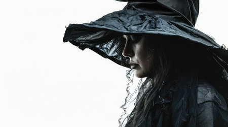 A witch with vampire makeup, in black cloak and hat, stares menacingly at the camera