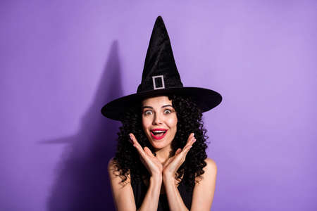 Smiling young woman portrays a witch for halloween in the studio. Celebration on October 31st.