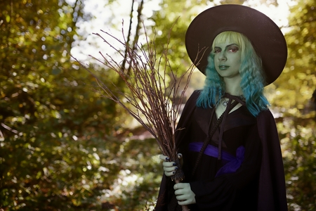Young girl with green hair and broom in suit of witch in forest. Halloween time