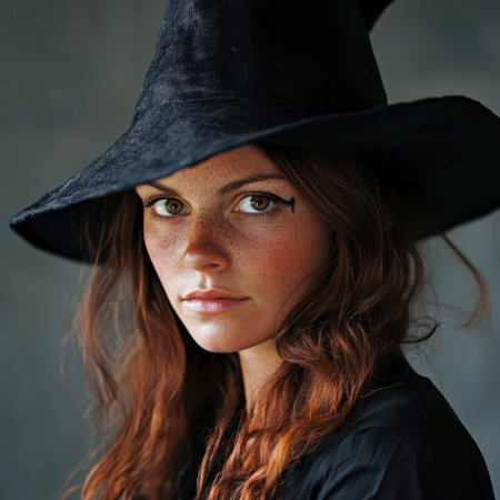 A young woman with vibrant red hair and freckles gazes directly at the camera. She wears a large black witch hat and has expressive makeup, creating a mystical yet contemporary vibe.