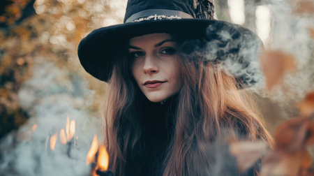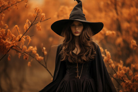 Mysterious woman dressed as a witch with a hat stands among burnt orange autumn leaves