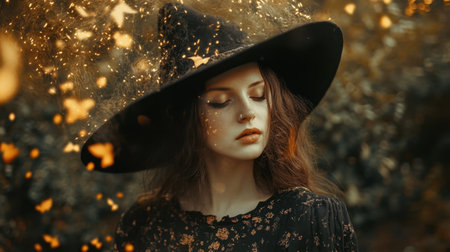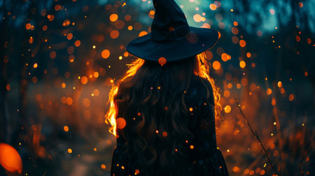 Woman with witch hat surrounded by bokeh lights in a magical forest. Concept of Halloween, fantasy, mystery, enchanted forest.