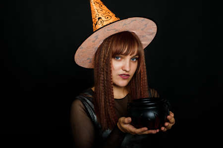 A young beautiful witch in a conical hat holds a Halloween pumpkin in her hands