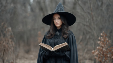 A mysterious sorceress clad in dark attire stands in a serene forest, holding an ancient book. The scene captures the essence of magic and solitude in nature.
