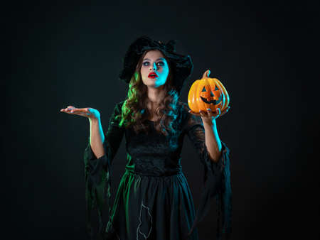 Young woman in witch Halloween costume hold a orange pumpkin over scary dark background.