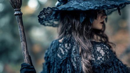 A woman in a wide-brimmed hat and dark clothing holds a broomstick in a forest