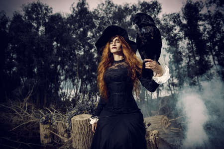 A portrait of an angry witch with a black raven outdoor. Magic, dark force, spell.