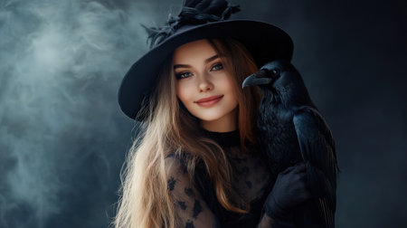 Halloween costume A pretty young witch with crow on her shoulder smiling with conspiracy on dark smoky background with copy space.