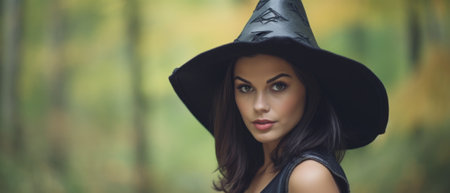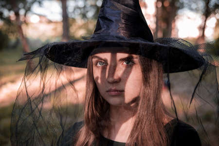 Pretty young beautiful woman in dark dress and witch hat standing in the middle of the autumn woods or park. Halloween party costume. Close-up portrait. Shadow on her face.