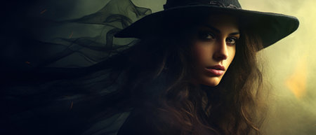 Beautiful young woman in witches hat with long hair background, Happy Halloween - Ai Generated