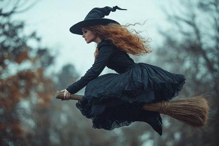 A mystical witch gracefully soars on her broomstick amid vibrant autumn foliage in a captivating scene