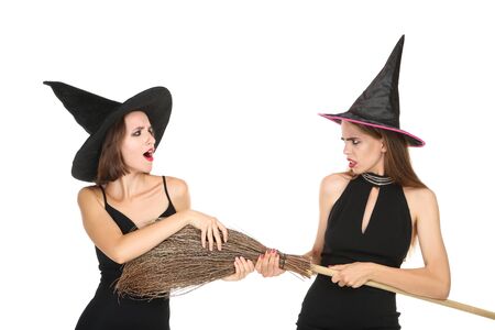 Two adult women looking as witches having fun and posing in dark room decorated for Halloween during photoshoot in nice studio