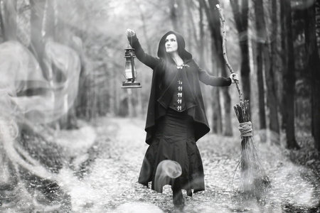 A portrait of a witch with a broodstick near the forest. Magic, dark force, spell.