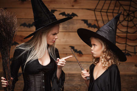 Halloween Concept - stressful witch mother teaching her daughter in witch costumes celebrating Halloween over bats and spider web on Wooden studio background.