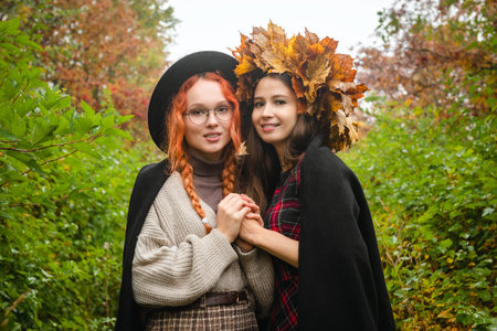 Two happy female friends are walking through the autumn forest in beautiful clothes.