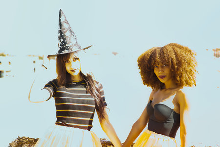 Two vintage witches perform magic ritual, with elixir in hand on the eve of Halloween