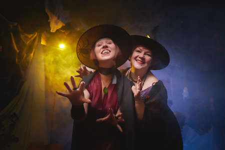Two young women looking like witches are having fun on Halloween in a dark room with yellow light and smoke. Carnival concept and Halloween party
