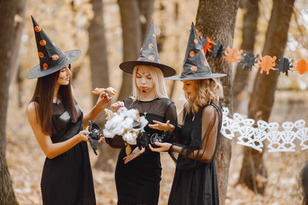 Three vintage witches perform magic ritual, throwing sweet at a table on the eve of Halloween