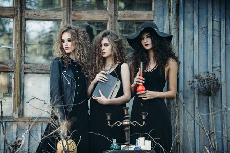 three vintage women as witches, poses near an abandoned building on the eve of Halloween