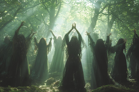 Coven of witches, modern witches gathered and do a ritual in the Park.