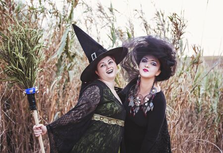 Two vintage witch sitting at the table in an abandoned place on the eve of Halloween