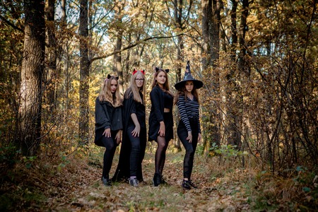 Five women as witches go to the Sabbath, a group of witches or Goths in black clothes and hats go down the street
